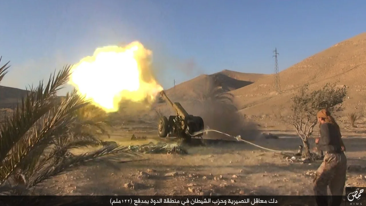 "Pounding Nusayri and Hizb Al Shaytan (party of Satan) bunkers in the Ad Dawwah region with a 122 mm cannon." Bottom right: Wilayah Homs Media Office logo.