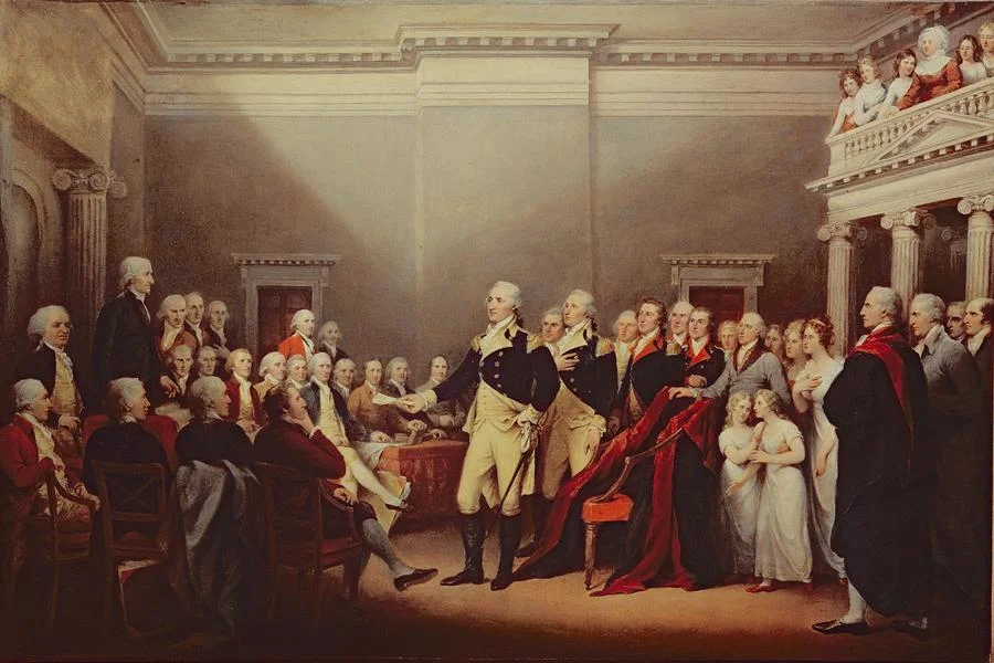 General George Washington Resigning His Commission, John Trumbull. General George Washington resigned his commission as Commander-in-Chief of the Army to the Congress, which was then meeting at the Maryland State House in Annapolis, on December 23, 1783. This action was of great significance in establishing civilian, rather than military rule, leading to a republic, rather than a dictatorship. (Public Domain)