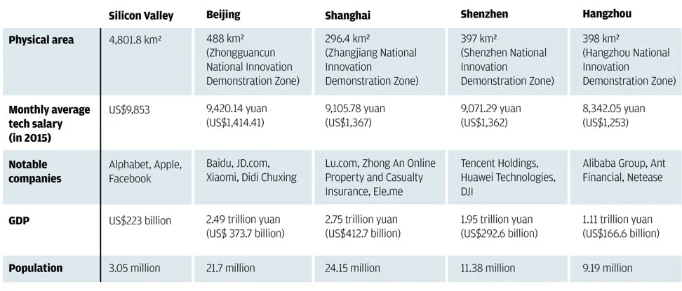 Comparison of different technology hubs, as published in "CES becomes the Chinese electronics show as Shenzhen, Dongguan exhibitors throng fair," South China Morning Post, January 9, 2018.