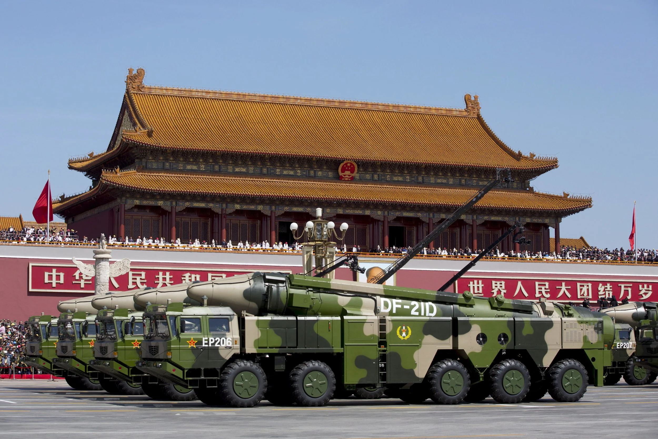 Chinese military vehicles carrying DF-21D anti-ship ballistic missiles, potentially capable of sinking a U.S. Nimitz-class aircraft carrier in a single strike, travel past Tiananmen Gate during a military parade to commemorate the 70th anniversary of the end of World War II in Beijing Thursday Sept. 3, 2015. (Andy Wong/Reuters)